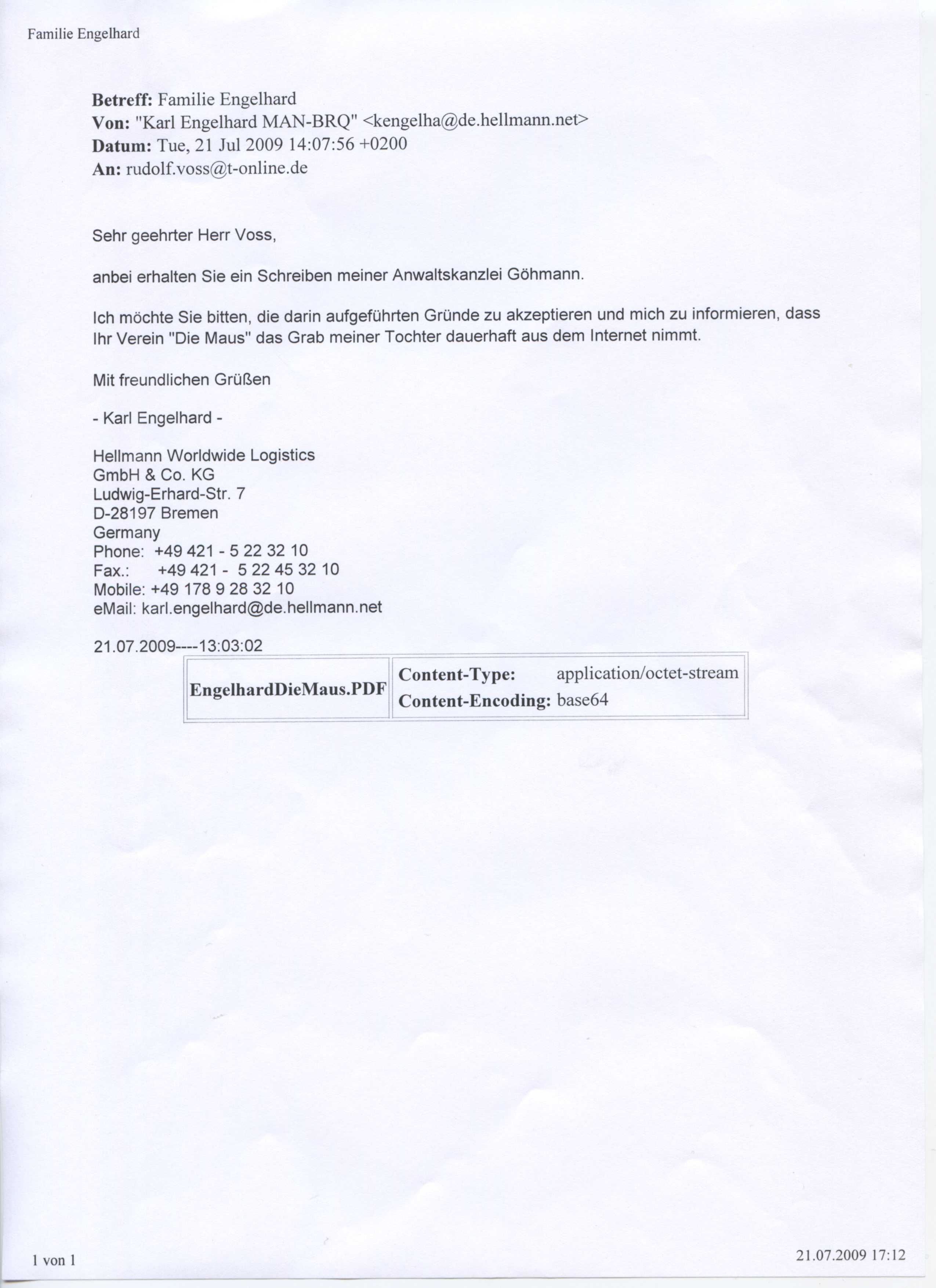 Sehr geehrter Herr Dr. Juling, Ihre E-Meil vom 22.7. ist bei mir eingegangen. Wenn ich den Inhalt werte, so muß ich feststellen, dass Sie nur das daraus lesen, was Sie lesen wollen, eine Änderung des Sachstandes stellen Sie nicht fest. Ich darf Sie darauf hinweisen, dass in der Vorstandssitzung der Vorschlag zum Beschluß im Fall Engelhard von mir vorgebracht wurde und zwar mit der Begründung, daß der Streitfall soweit fortgeschritten ist, Herr Engelhard ohne Rückantwort auf das Schreiben von Dr. Juling an die MAUS sofort seinen Rechtsanwalt eingeschaltet hat und seinen Rechtsanwalt veranlaßte, ein Gerichtsverfahren anzustreben. Dieser Sachstand hat sich durch die E-Mail von Herrn Engelhard von 21.07. und dem Schreiben des Rechtsanwalts (beide Schreiben als Anlage) dadurch geändert, dass er, die im Schreiben des Rechtsanwalts aufgeführten Gründe, akzeptiert. In der Begründung ist seine persönliche Betroffenheit über den Verlust seiner Tochter und das seine Trauerarbeit nicht abgeschlossen ist und es ihn schmerzlich berührt, das Bild seiner Tochter im Internet zu sehen. Wenn Ihnen, Herr Dr. Juling, diese Begründungen nicht reichen, dann kann es nur an Ihrer Kompromisslosigkeit liegen. Was erwarten Sie von einem Betroffenen, dass er Kniefälle vor Ihnen machen und Bitte Bitte sagen muß? Es ist ein neuer Sachstand eingetreten und ich erwarte, dass sofort der Grabstein auf unserer Homepage gelöscht wird. Sollten Sie meinem Wunsch nicht nachkommen, dann kann ich nicht mehr Vorsitzender eines Vereins sein, der ich über die Gefühle anderer Menschen hinwegsetzt. Ich erwarte, daß bis Freitag, den 24. Juli der Grabstein auf unserer Homapage gelöscht ist. Mit freundlichen Grüßen Rudolf Voß